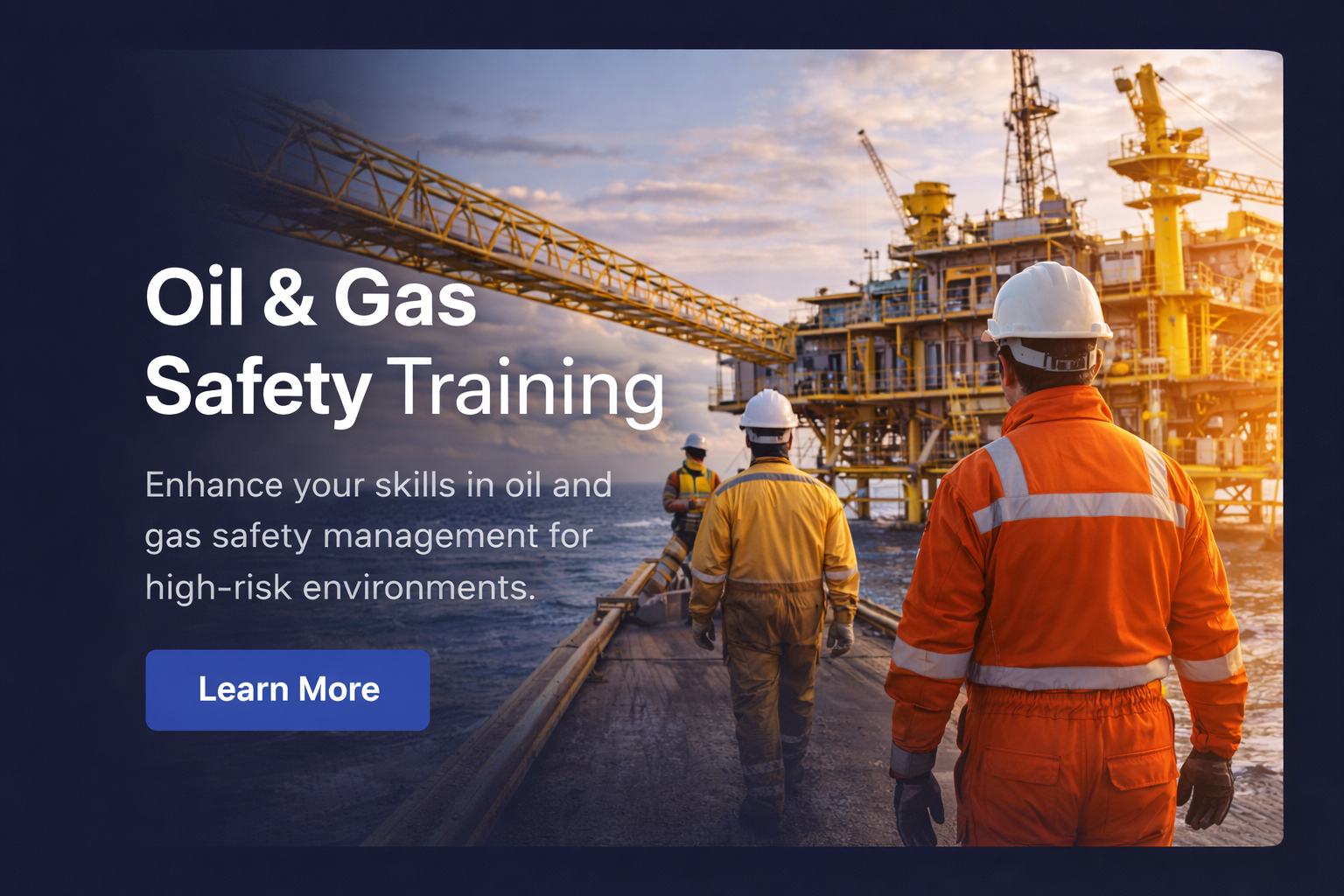 Participants will gain in-depth knowledge of hazard identification, risk assessment techniques, and control measures specific to oil rigs, refineries, drilling sites, and offshore platforms. The training covers key safety areas including fire prevention and control, emergency response planning, confined space entry, working at height, permit-to-work systems, personal protective equipment (PPE), and safe handling of hazardous substances. Emphasis is placed on proactive risk management and developing a strong safety culture within the organization.